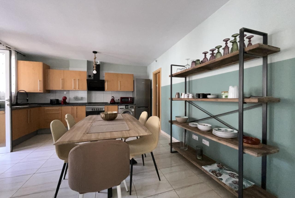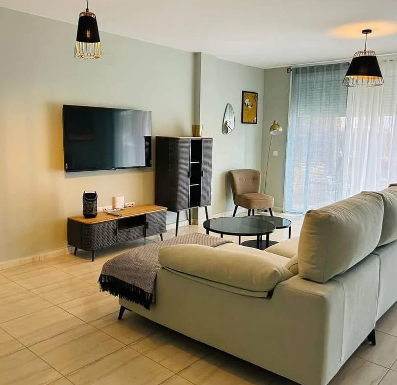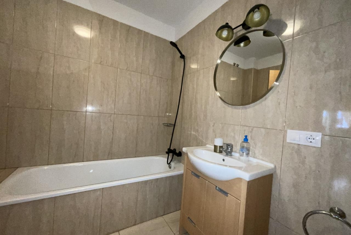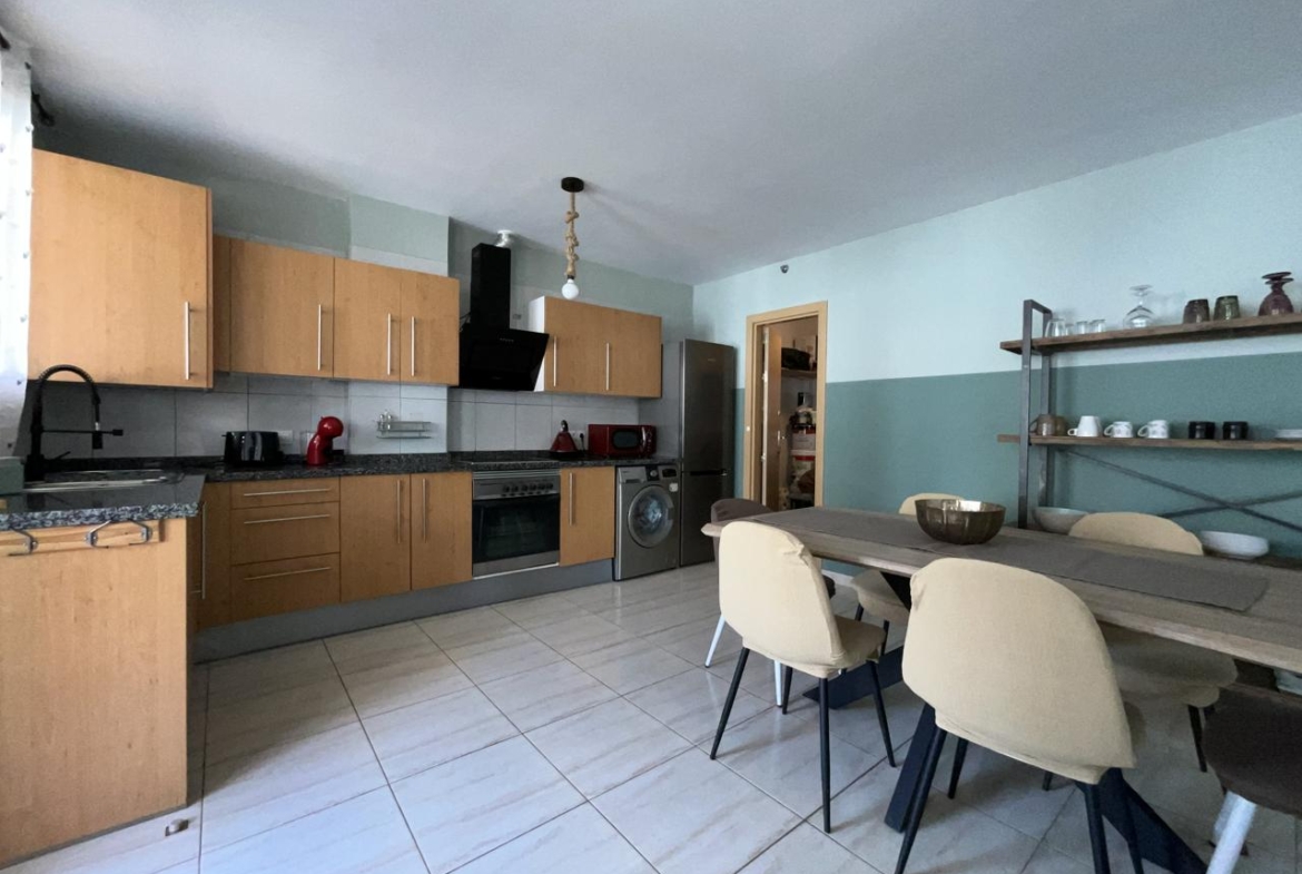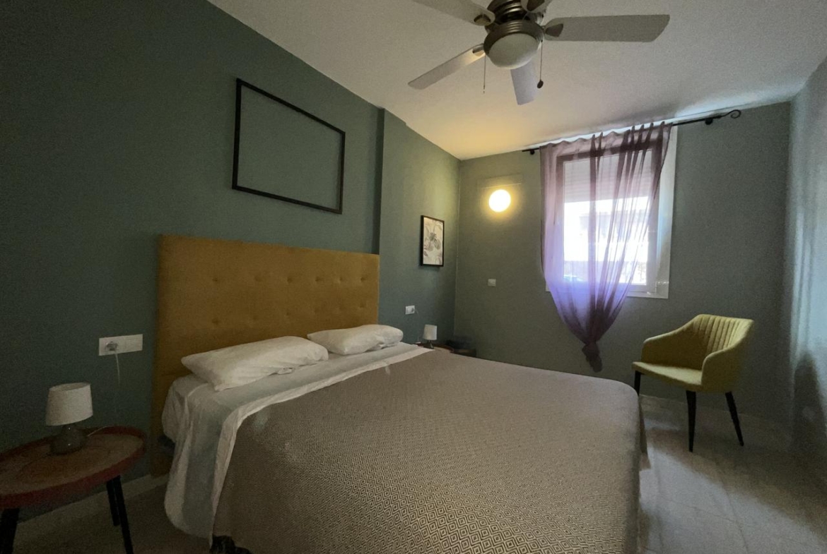 Diese außergewöhnliche Erdgeschosswohnung, die komplett renoviert wurde, bietet einen modernen und komfortablen Raum, der sofort bezugsfertig ist. Mit einer Wohnfläche von 110 m² und 140 m² bebauter Fläche verfügt sie über zwei Schlafzimmer, die mit Einbauschränken und Betten ausgestattet sind, sowie über zwei Bäder. Das geräumige Wohnzimmer geht harmonisch in die offene Küche über und bietet eine gemütliche und funktionelle Atmosphäre.