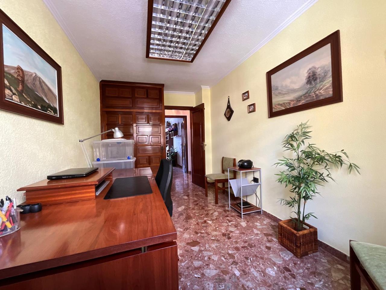 Avanzando por el pasillo encontramos una estancia actualmente habilitada como despacho, perfecta para teletrabajo o estudio. Frente a ella, un dormitorio de menor tamaño, ideal como habitación infantil o cuarto auxiliar. Más adelante, un dormitorio con armario y cama de matrimonio, un baño principal con ducha y un segundo baño también equipado con ducha garantizan comodidad y funcionalidad para toda la familia. El dormitorio principal culmina el recorrido: un espacio amplio, pensado para el descanso sin renunciar a la sensación de libertad.