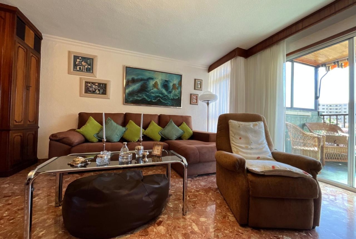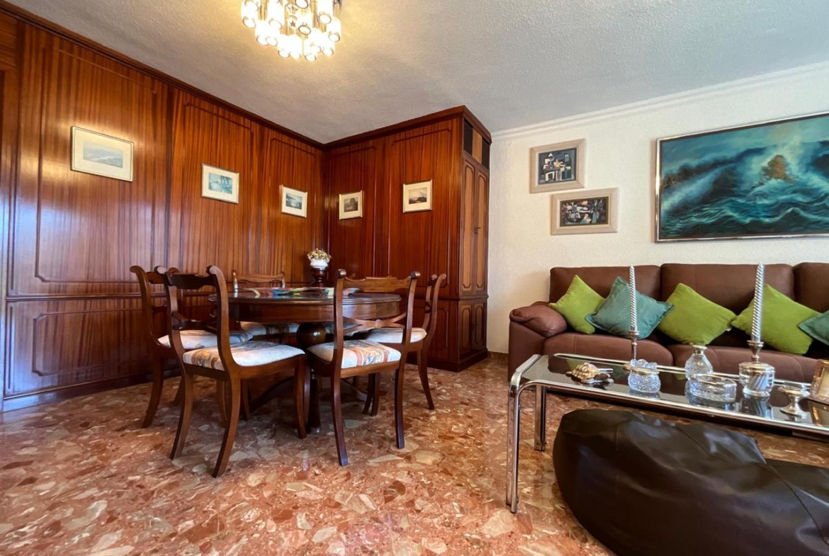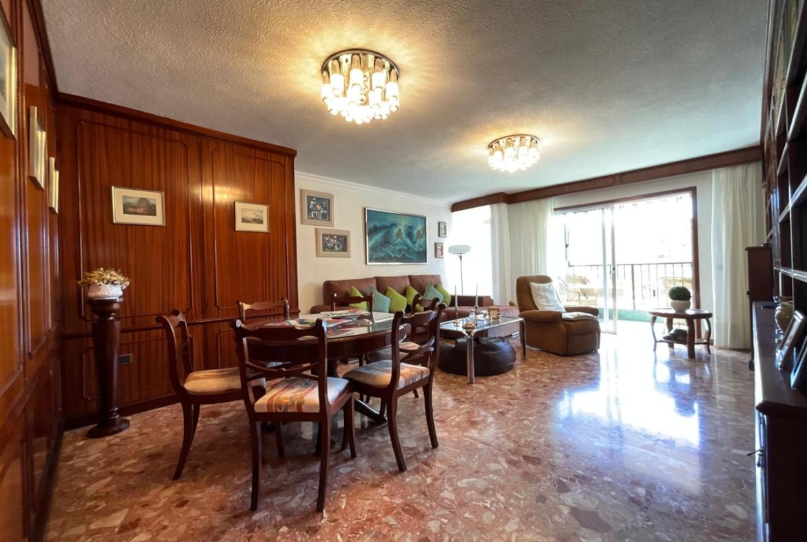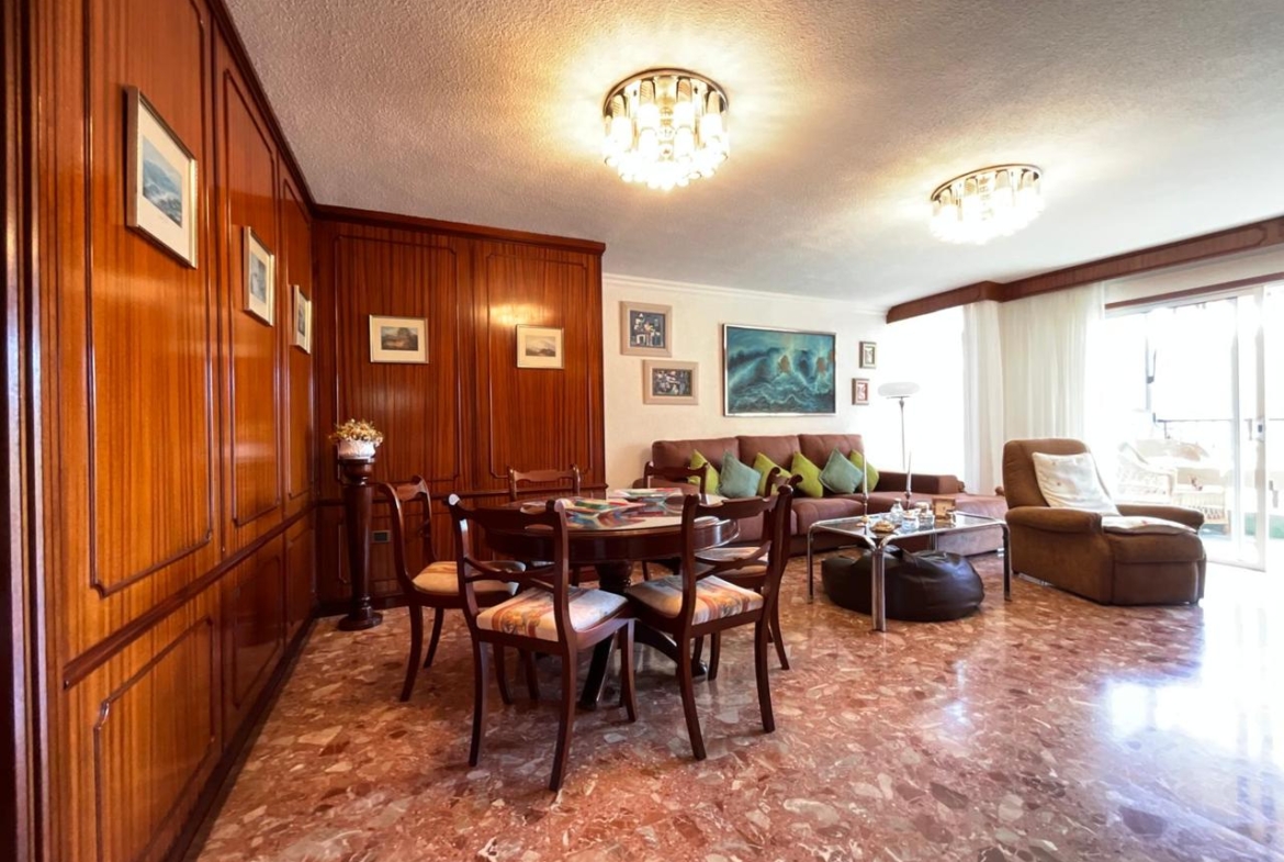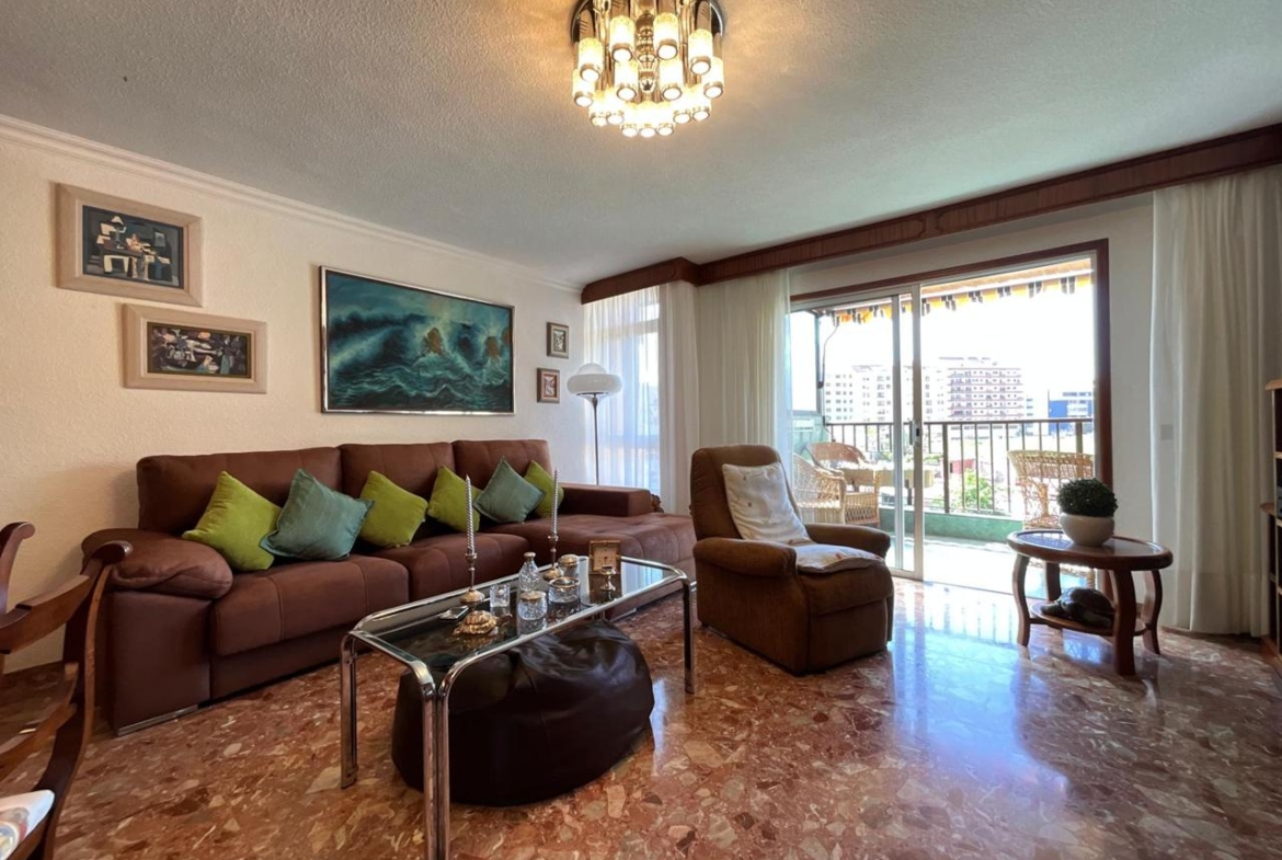 A la izquierda del pasillo se abre la gran sala de estar, bañada por una luminosidad constante gracias a su proximidad a la amplia terraza. Las vistas parciales al mar y a la ciudad elevan la experiencia cotidiana, convirtiendo cada atardecer en un pequeño espectáculo privado. El salón cuenta con un gran mueble de almacenaje, un sofá de generosas dimensiones y zona de comedor perfectamente integrada, ideal tanto para la vida familiar como para recibir invitados con estilo.