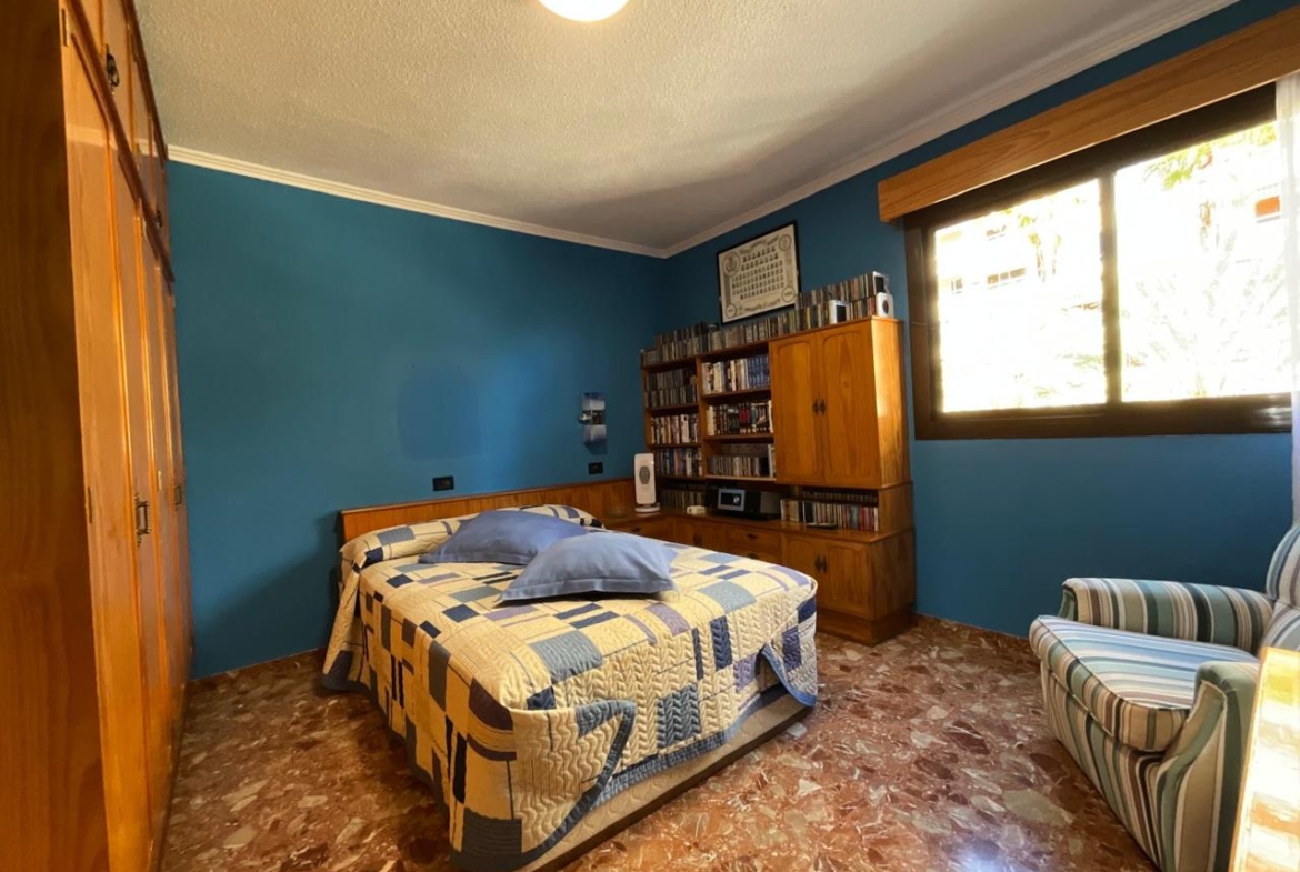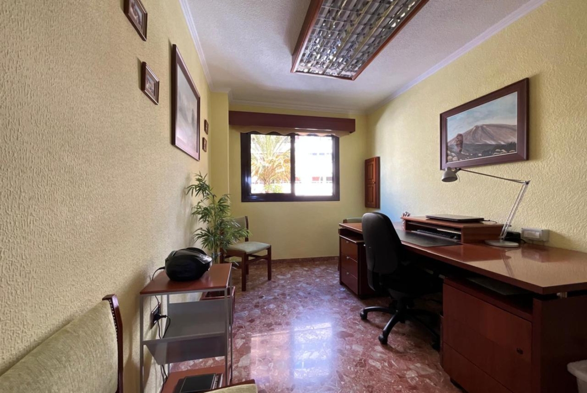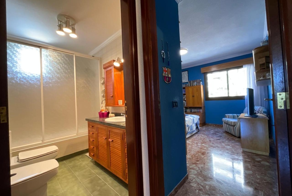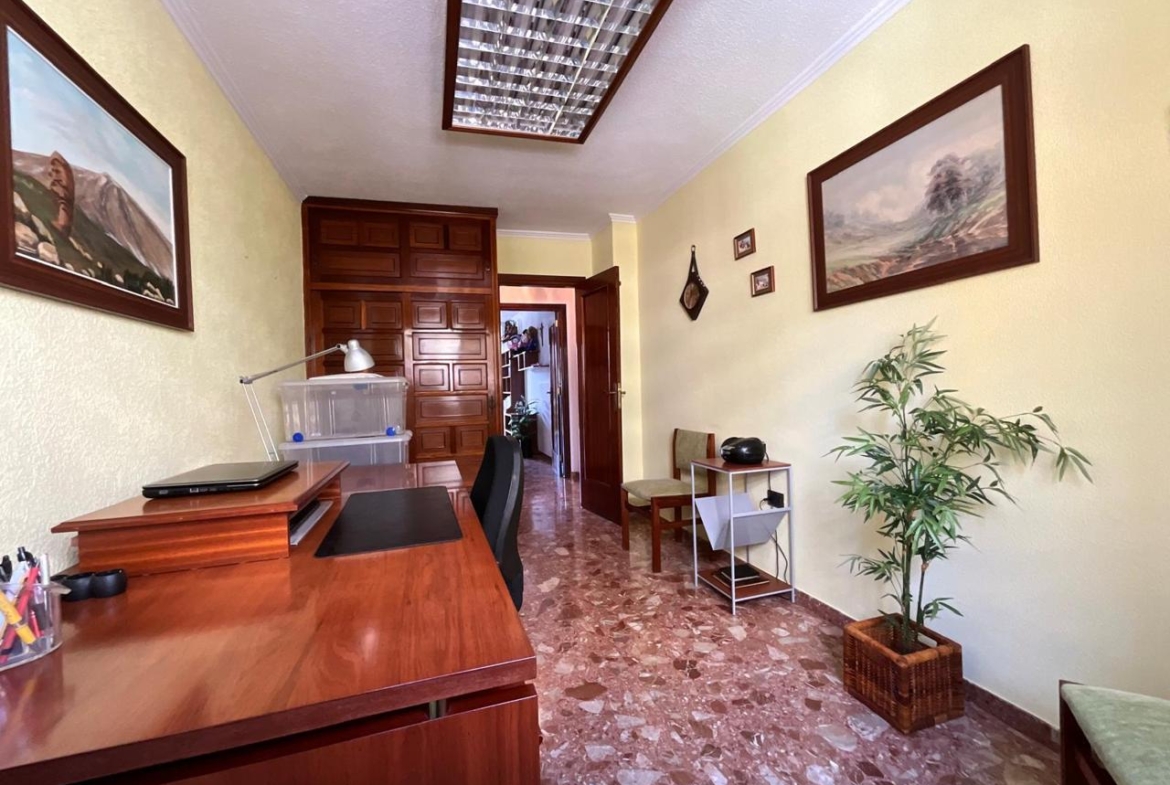 Avanzando por el pasillo encontramos una estancia actualmente habilitada como despacho, perfecta para teletrabajo o estudio. Frente a ella, un dormitorio de menor tamaño, ideal como habitación infantil o cuarto auxiliar. Más adelante, un dormitorio con armario y cama de matrimonio, un baño principal con ducha y un segundo baño también equipado con ducha garantizan comodidad y funcionalidad para toda la familia. El dormitorio principal culmina el recorrido: un espacio amplio, pensado para el descanso sin renunciar a la sensación de libertad.
